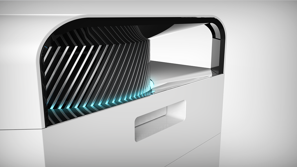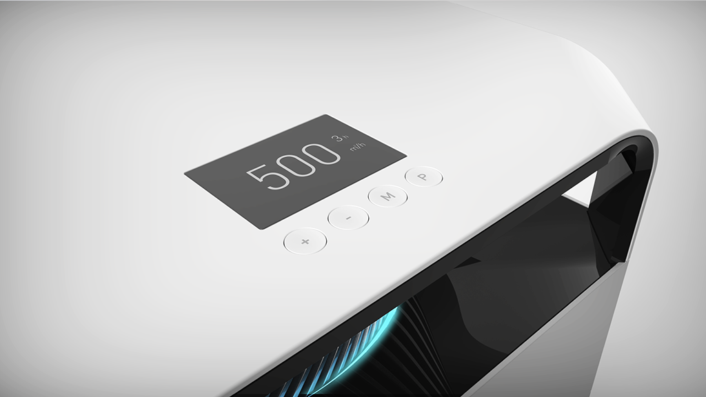 該產(chǎn)品底部進(jìn)風(fēng),風(fēng)機(jī)置頂,空氣流經(jīng)層層濾網(wǎng),由頂部的風(fēng)機(jī)將潔凈的空氣向四個(gè)方向噴出,合理的結(jié)構(gòu)保證了盡可能大的濾網(wǎng)有效橫截面積,減少空氣流經(jīng)路徑的轉(zhuǎn)向?qū)艋芰?lái)的影響。另外空氣凈化器提供了四層位置安裝濾網(wǎng),可靈活自定義,根據(jù)自身需求靈活選擇濾網(wǎng)組合。同時(shí)還創(chuàng)新性地提供了多款專(zhuān)效濾網(wǎng),針對(duì)甲醛、細(xì)菌、煙味等,專(zhuān)注于解決不同使用環(huán)境中用戶(hù)的痛點(diǎn),滿(mǎn)足每一個(gè)用戶(hù)對(duì)潔凈空氣的需求。設(shè)計(jì)概念重點(diǎn)表現(xiàn)未來(lái)感及科技感,電機(jī)防護(hù)罩周?chē)碾[藏式燈帶可直觀的反映出室內(nèi)的空氣質(zhì)量情況,是整個(gè)設(shè)計(jì)的點(diǎn)睛之筆。設(shè)計(jì)語(yǔ)言在保持硬朗高效率寓意的前提下也進(jìn)行了去邊角處理,增加產(chǎn)品的友好性。色彩材質(zhì)方面以代表潔凈的白色為主色調(diào),電機(jī)罩部分以銀色寓意功能強(qiáng)大,中間以黑色進(jìn)行過(guò)度和增加對(duì)比。體現(xiàn)出外表極致簡(jiǎn)潔,功能極其強(qiáng)大的核心理念。